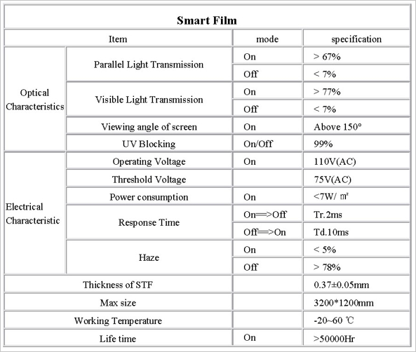 Smart film have the requirements of effective sound insulation, sound insulation material using a special technique and add enhanced treatment, smart film have a special technology soundproofing layer being formed.Within special optical processing technology, can effectively eliminate more than 99% of the external environment, UV and thermal radiation (about 65%) and to ensure that the glass defogging and without leaving water marks.In the case of electricity, transparent and clear glass. In the case of no electricity, glass rendered opaque state.